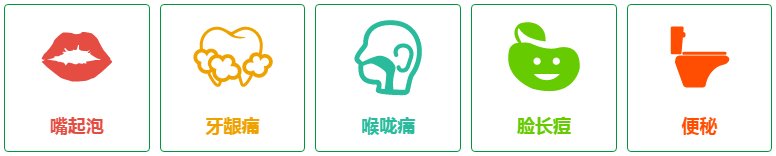 癥狀:牙齦腫痛、口腔潰瘍、咽喉腫痛、便秘、臉長痘。